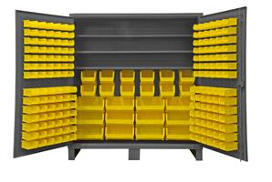 72 in. wide extra heavy duty all welded 12 gauge steel, lockable cabinet, with 192 yellow hook-on bins, 3 adjustable shelves, 750 lbs capacity per shelf, recessed door style, Gray, textured powder coat finish.
