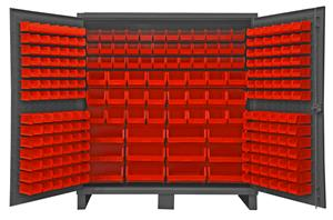 72 in. wide extra heavy duty all welded 12 gauge steel, lockable cabinet, with 240 red hook-on bins, recessed door style, Gray, textured powder coat finish.