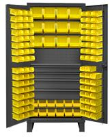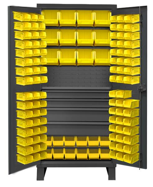 36 in. wide extra heavy duty all welded 12 gauge steel, lockable cabinet, with 120 yellow hook-on bins, 2 adjustable shelves, 1750 lbs capacity per shelf, 4 drawers, recessed door style, Gray, textured powder coat finish.