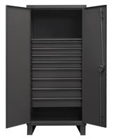 36 in. wide extra heavy duty all welded 12 gauge steel, lockable cabinet, 1 adjustable shelf, 1900 lbs capacity per shelf, 8 drawers, recessed door style, Gray, textured powder coat finish.