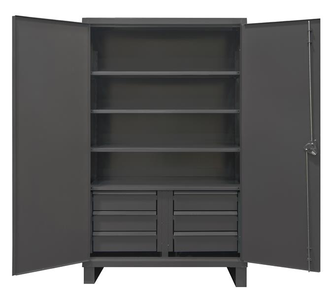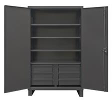 60 in. wide extra heavy duty all welded 12 gauge steel, lockable cabinet, 3 adjustable shelves, 1650 lbs capacity per shelf, 6 drawers, recessed door style, Gray, textured powder coat finish.