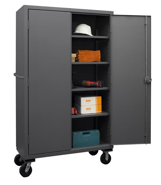 Mobile Cabinet, 48 in. wide, 12 gauge, lockable mobile cabinet, 4 adjustable shelves, recessed door style, Gray. This product has recessed door style. This product has lockable cabinet.