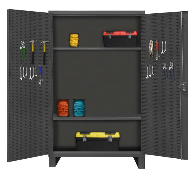 Durham extra heavy duty all welded 12 gauge steel pegboard and shelf cabinet. 2 adjustable shelves. Doors open at full 180 degree. Weather resistant, includes sloped top, a rain guard, gasket sealed door frames and filtered vents to keep out moisture and dust. Shelves bolt into place easily using fasteners provided and adjust on 2-1/4 in. centers. 6 in. High box style legs, made using 3/16 in. steel, offer space for forklift truck forks and allow lagging to the floor. Cabinet has Gray, textured powder coat finish.
