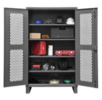 Durham extra heavy duty all welded 12 gauge steel lockable ventilated storage cabinet. (4) 14 gauge heavy duty shelves. Shelves bolt into place easily using fasteners provided and adjust on 2-1/4 in. centers. 6 in. height base/legs which provide access for forklifts; pre-drilled holes allow for lagging to the floor (constructed of 3/16 in. steel). Gray, textured powder coat finish.