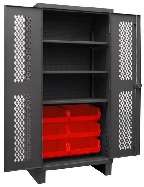 Ventilated Cabinet, 36 in. wide 12 gauge extra heavy duty ventilated cabinet with 6 red hook-on bins and 3 adjustable shelves. Fully welded louvered panel back reinforces back and holds hook-on-bins. Sturdy 3-point steel locking handle with 3/8 in. diameter rods and Provisions F.