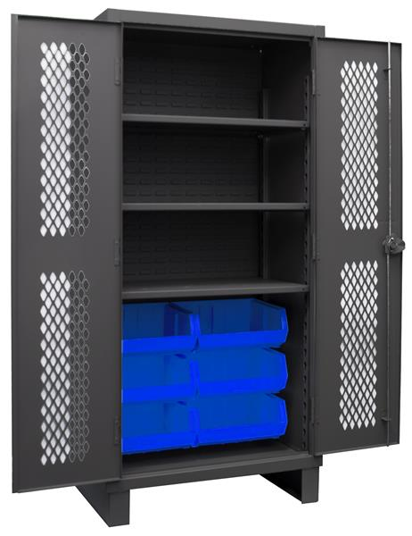 Ventilated Cabinet, 36 in. wide 12 gauge extra heavy duty ventilated cabinet with 6 blue hook-on bins and 3 adjustable shelves. Fully welded louvered panel back reinforces back and holds hook-on-bins. Sturdy 3-point steel locking handle with 3/8 in. diameter rods and Provisions F.