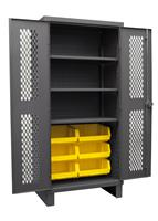 Ventilated Cabinet, 36 in. wide 12 gauge extra heavy duty ventilated cabinet with 6 yellow hook-on bins and 3 adjustable shelves. Fully welded louvered panel back reinforces back and holds hook-on-bins. Sturdy 3-point steel locking handle with 3/8 in. diameter rods and Provisions F.