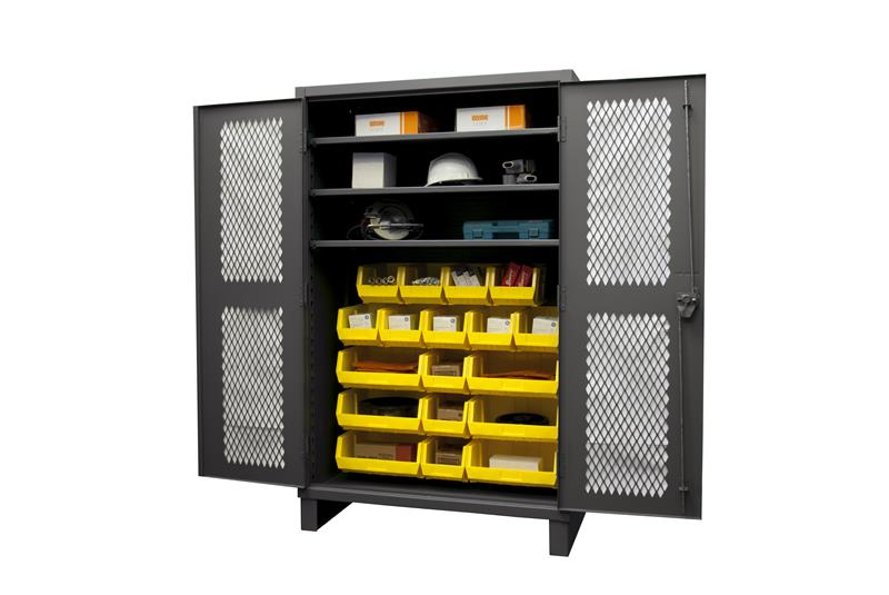 Ventilated Cabinet, 48 in. wide 12 gauge extra heavy duty ventilated cabinet with 18 yellow hook-on bins and 3 adjustable shelves. Fully welded louvered panel back reinforces back and holds hook-on-bins. Sturdy 3-point steel locking handle with 3/8 in. diameter rods and Provisions F.
