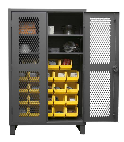 Ventilated Cabinet, 48 in. wide 12 gauge extra heavy duty ventilated cabinet with 24 yellow hook-on bins and 2 adjustable shelves. Fully welded louvered panel back reinforces back and holds hook-on-bins. Sturdy 3-point steel locking handle with 3/8 in. diameter rods and Provisions F.