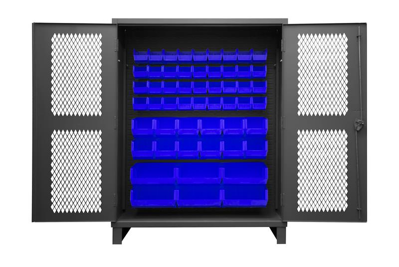 Ventilated Cabinet, 60 in. wide 12 gauge extra heavy duty ventilated cabinet with 54 blue hook-on bins. Fully welded louvered panel back reinforces back and holds hook-on-bins. Sturdy 3-point steel locking handle with 3/8 in. diameter rods and Provisions F.