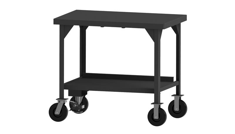 Heavy Duty Mobile Workbench with 8" x 2" Phenolic bolt-on casters, (2) rigid and (2) swivel, bottom shelf has back stop with provisions for optional drawer and floor lock, gray