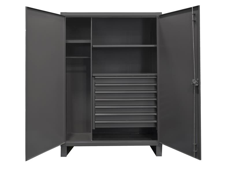 Ventilated Cabinet, 36 in. wide 12 gauge extra heavy duty ventilated cabinet with 7 drawers and 2 adjustable shelves. Fully welded louvered panel back reinforces back. Sturdy 3-point steel locking handle with 3/8 in. diameter rods and Provisions F.