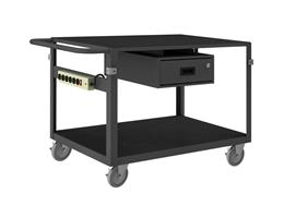 Instrument Cart with (4) swivel 5" x 1-1/4" Polyurethane casters, side brakes, 2 shelves, non-slip black vinyl matting-wood panel underneath, 1 drawer, 4 bumper corners, 1 power strip and handle