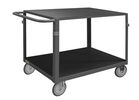 Instrument Cart with (4) 5" x 1-1/4" swivel Polyurethane casters with side brakes, 2 shelves with non-slip black vinyl matting-wood panel underneath, 4 bumper corners and tubular push handle