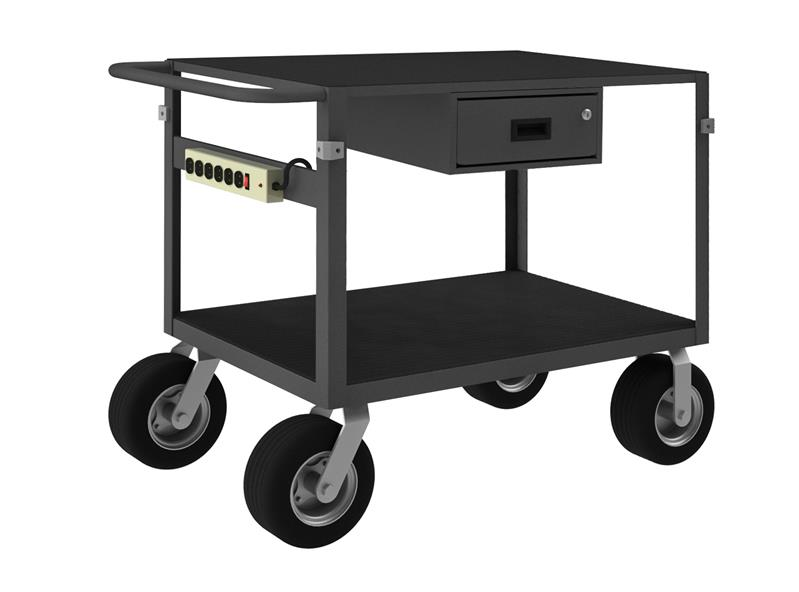 Instrument Cart with 8" x 2" Semi-Pneumatic casters, (2) rigid and (2) swivel, 2 shelves, Non-slip black vinyl matting-wood panel underneath, 1 drawer, 4 bumper corners, power strip, tubular handle