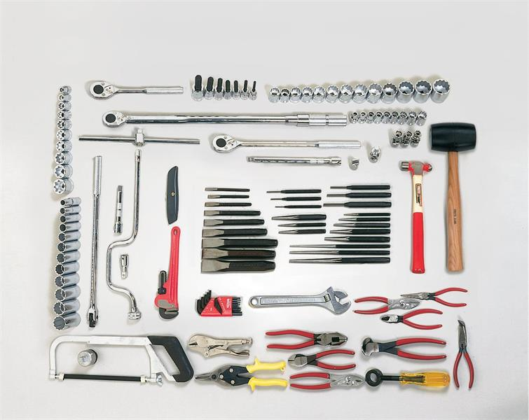 Includes: 3 wrenches, 55 sockets, 6 Pliers, 9 chisels