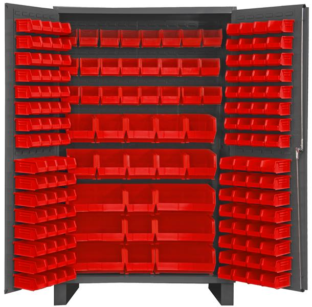 Ventilated Cabinet, 48 in. wide 14 gauge extra heavy duty ventilated cabinet with 171 red hook-on bins and 2 adjustable shelves. Fully welded louvered panel back reinforces back and holds hook-on-bins. Sturdy 3-point steel locking handle with 3/8 in. diameter rods and Provisions F.