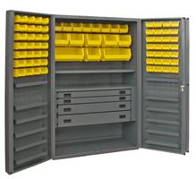 Ventilated Cabinet, 48 in. wide 14 gauge extra heavy duty ventilated cabinet with 72 yellow hook-on bins, 1 adjustable shelves, 12 door shelves, and 4 drawers. Fully welded louvered panel back reinforces back and holds hook-on-bins. Sturdy 3-point steel locking handle with 3/8 in. diameter rods and Provisions F.