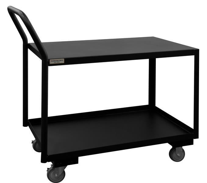 Low Deck Service Truck with 4" x 1-1/4" Polyurethane casters, (2) rigid and (2) swivel with side brakes, 2 shelves, 1-1/2" lips up on the bottom shelf and tubular offset handle, gray