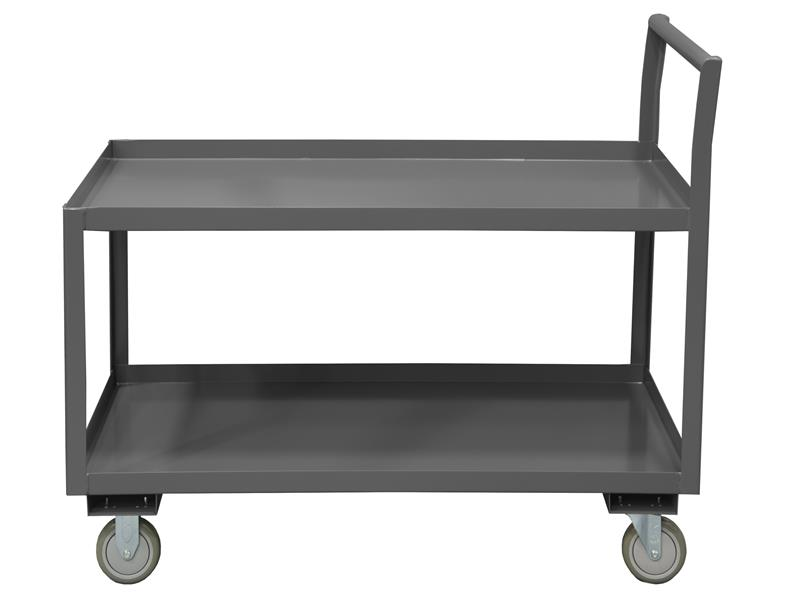 Low Deck Service Truck with 5" x 1-1/4" Polyurethane casters, (2) rigid and (2) swivel with side brakes, 2 shelves, 1-1/2" lips up on both shelves and raised offset handle, gray