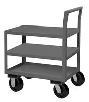 Low Deck Service Truck with 8" x 2" Phenolic casters, (2) rigid and (2) swivel, 3 shelves, 1-1/2" lips up on middle and bottom shelves with raised offset handle, gray