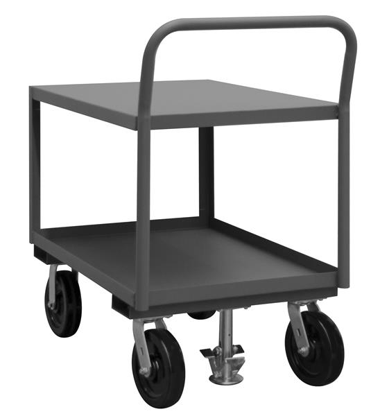 Low Deck Service Truck with 8" x 2" Phenolic casters, (2) rigid and (2) swivel, 2 shelves, tubular offset handle, floor lock and 1-1/2" lips up on bottom shelf, gray