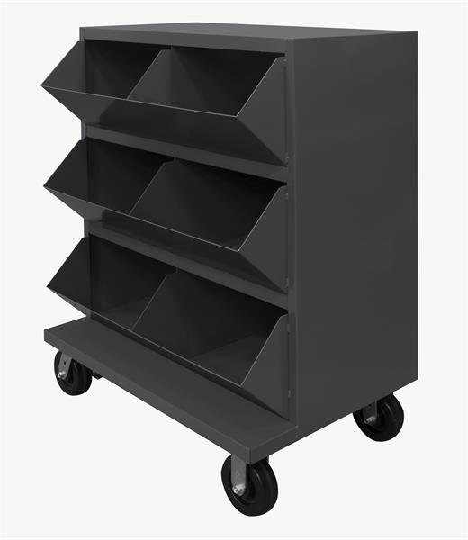 Mobile Storage Bin Cabinet, 36 in. wide 14 gauge extra heavy duty ventilated cabinet with 6 open bins and 1 top shelf. Fully welded louvered panel back reinforces back. Sturdy tubular push handle with 3/8 in. diameter rods and Provisions F.