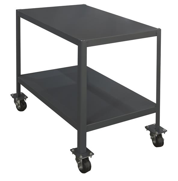 Mobile Medium Duty Machine Table with (4) 3" x 1-13/16" Phenolic swivel casters, 2 shelves and 1-1/2" x 3/16" angle iron frame with provisions for optional drawer, gray