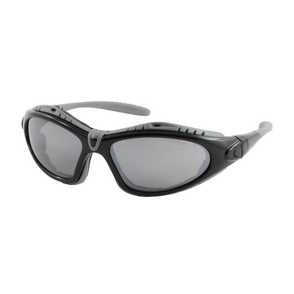 One Size Fits All Full Frame Safety Glasses with Black Frame, Foam Padding, Silver Mirror Lens and Anti-Scratch / Anti-Fog Coating
