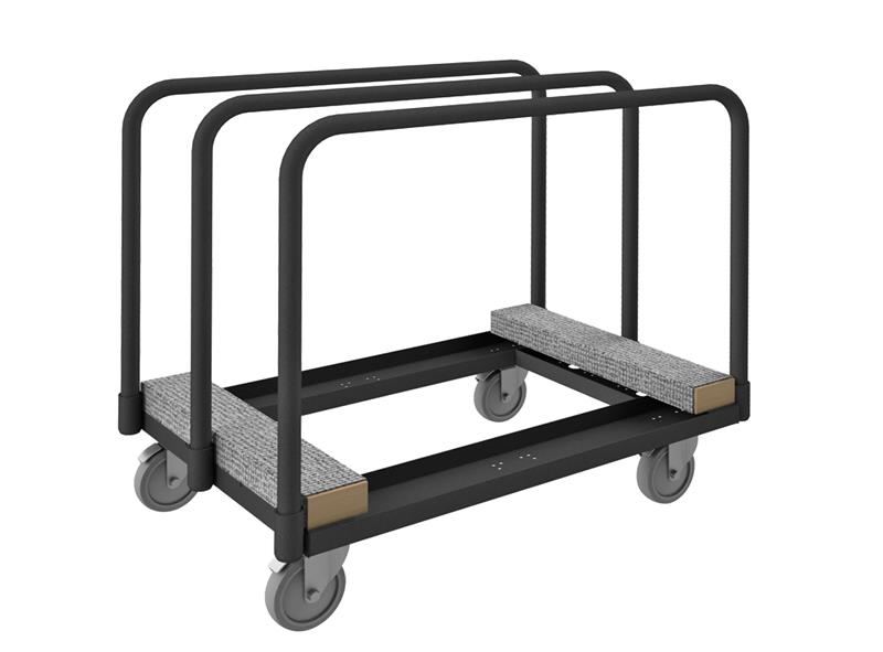 Panel Moving Truck with 5" x 1-1/4" Polyurethane casters, (4) swivel with side brakes, wood end rail with carpet and 3 removable dividers, gray