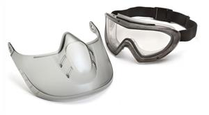Capstone goggle incorporated with removable shield provides full face protection. The shield with ratchet allows user to open or close in 3 positions for adjustment; 4 ventilation holes provide appropriate airflow. The polycaronate shield conforms to the face offering increased impact and dust protection. Indirect-vent frame provides protection against splash and dust. Soft vinyl goggle body conforms to facial contours for a very comfortable fit. High Impact resistance against flying particles. Fits over prescription glasses. Fully adjustable elastic band. Includes 2 disposable tear off visors, which can be replaced as they become dirty or scratched.