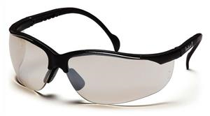 Venture II - Black Frame/Indoor/Outdoor Mirror Anti-Fog Lens - 9.75 Base curved lens provides full side protection without distracting seams or traditional type side shields. Nose buds secure the glass and prevent slipping while providing a pillow soft fit. Fully adjustable temples - 4 size settings. Lenses provide 99% protection against harmful UV rays. Lenses are coated for superior scratch resistance.
