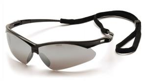 PMXTREME - Black Frame/Silver Mirror Lens with Black Cord - Includes black lanyard cord with rubber tips for extra security while wearing. Ventilated, straight-back flexible temples provide cool, pressure free fit. Rubber, temple tips keep eyewear secure for the active worker. 9 base curve polycarbonate lens provides maximum vision protection.