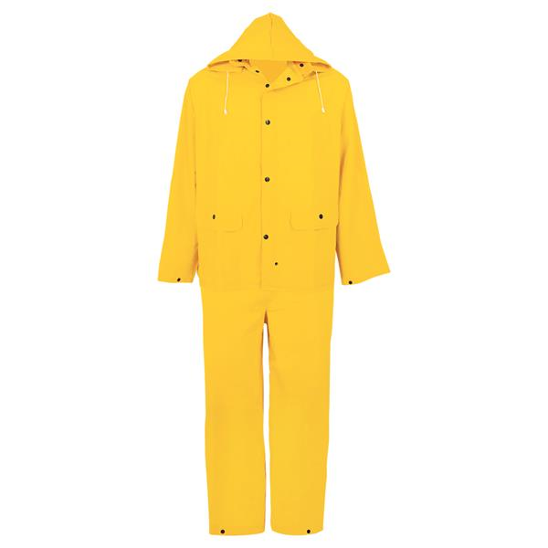 Yellow 0.35 mm raincoat with zipper and button up closure, 2 front pockets, wrist snaps, 3 back vents, corduroy collar and detachable hood. Yellow 0.35 mm bib pants with over the shoulder ties, front access hole and ankle snaps. Sized to fit over work clothes.