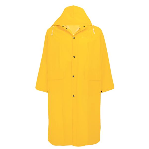 49 in. long raincoat, 0.35 mm PVC, yellow with detachable hood, button closure and clear name badge holder.