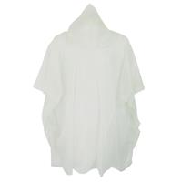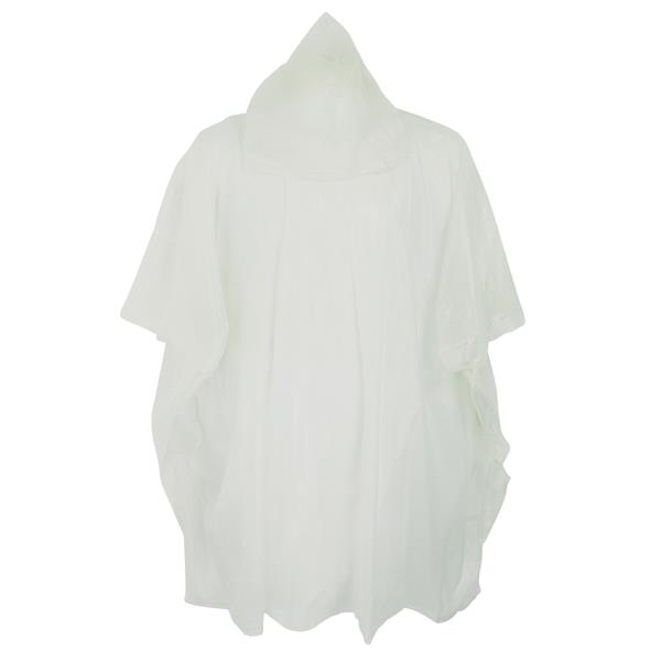 Single ply clear PVC poncho with attached hood, one size fits most. Features snaps on sides for closure.