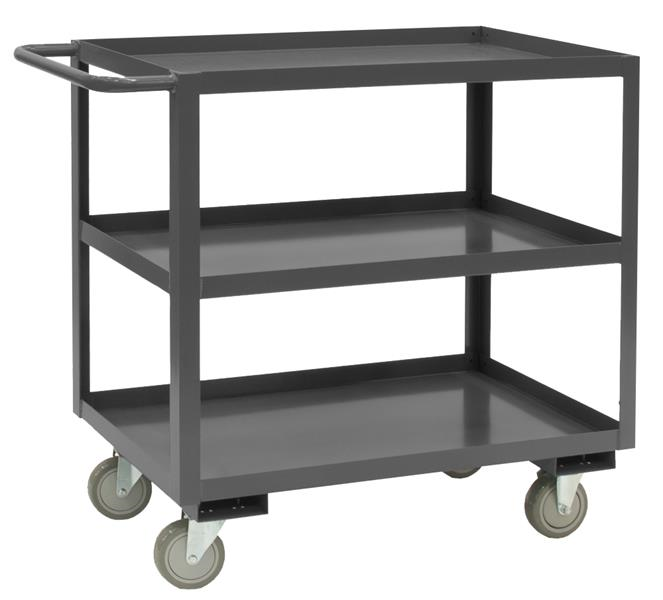 Rolling Service Cart with 5" x 1-1/4" Polyurethane casters, (2) rigid, (2) swivel with side brakes, 3 shelves, all 1-1/2" lips up with tubular push handle, gray