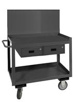 Mobile Workstation with 5" x 1-1/4" Polyurethane casters, (2) rigid, (2) swivel with side brakes, 2 shelves, 2 drawersand pegboard pan, all 1-1/2" lips up with tubular push handle, gray
