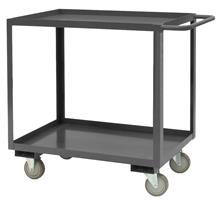 Rolling Service Cart with 5" x 1-1/4" Polyurethane casters, (2) rigid, (2) swivel with side brakes, 2 shelves, all 1-1/2" lips up with tubular push handle, gray