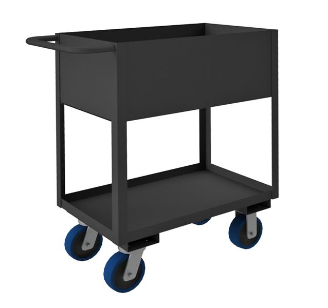 Rolling Service Cart with 12" Lips Up, 6" x 2" Polyurethane casters, (2) rigid, (2) swivel, 2 shelves, bottom shelf has 1-1/2" lips up, top shelf has 12" sides with tubular push handle, gray