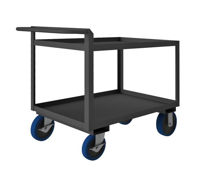 Rolling Service Cart with 8" x 2" Polyurethane casters, (2) rigid, (2) swivel with brakes, 2 shelves, all 1-1/2" lips up with raised tubular push handle, gray