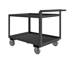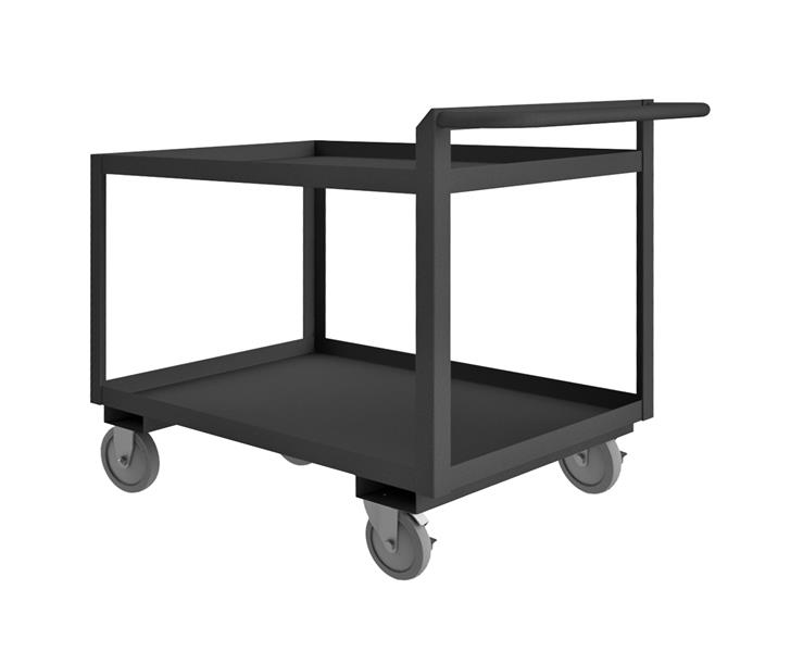 Rolling Service Cart with 5" x 1-1/4" Polyurethane casters, (2) rigid, (2) swivel with side brakes, 2 shelves, all 1-1/2" lips up with raised tubular push handle, gray