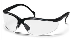 Venture II - Black Frame/Clear Lens - 9.75 Base curved lens provides full side protection without distracting seams or traditional type side shields. Nose buds secure the glass and prevent slipping while providing a pillow soft fit. Fully adjustable temples - 4 size settings. Lenses provide 99% protection against harmful UV rays. Lenses are coated for superior scratch resistance.