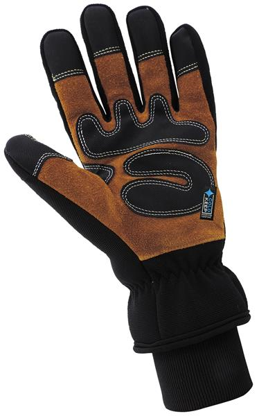 Featuring a flexible spandex shell and a premium split cow leather palm, this cold weather glove provides a high level of dexterity and comfort in low temperatures. Insulated with 120 grams of Cold Keepinsulation, it also has a dual cuff and waterproof barrier inside which prevent moisture and cold from entering the glove. Easy to see with a reflective stripe on the back, it is reinforced with Griptex material on fingertips and palm.