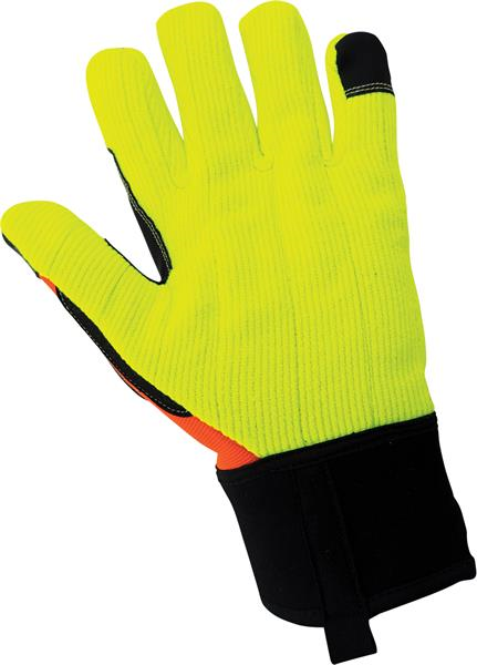 These gloves feature a high-visibility orange spandex back with a contrasting high-visibility yellow/green cotton corded double palm. The back of the hand and fingers feature extra soft TPR impact protection.