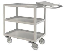 Stainless Order Picking Cart with 5" x 1-1/4" Polyurethane casters, (2) rigid and (2) swivel with side brakes, 2 shelves and a writing shelf, all 1-1/2" lips up and tubular push handle