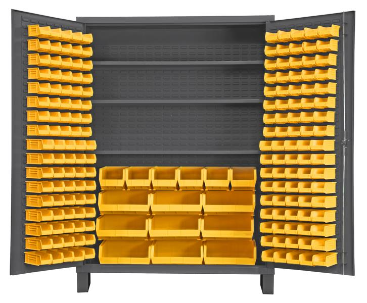 Ventilated Cabinet, 60 in. wide 14 gauge extra heavy duty ventilated cabinet with 185 yellow hook-on bins and 3 adjustable shelves. Fully welded louvered panel back reinforces back and holds hook-on-bins. Sturdy 3-point steel locking handle with 3/8 in. diameter rods and Provisions F.