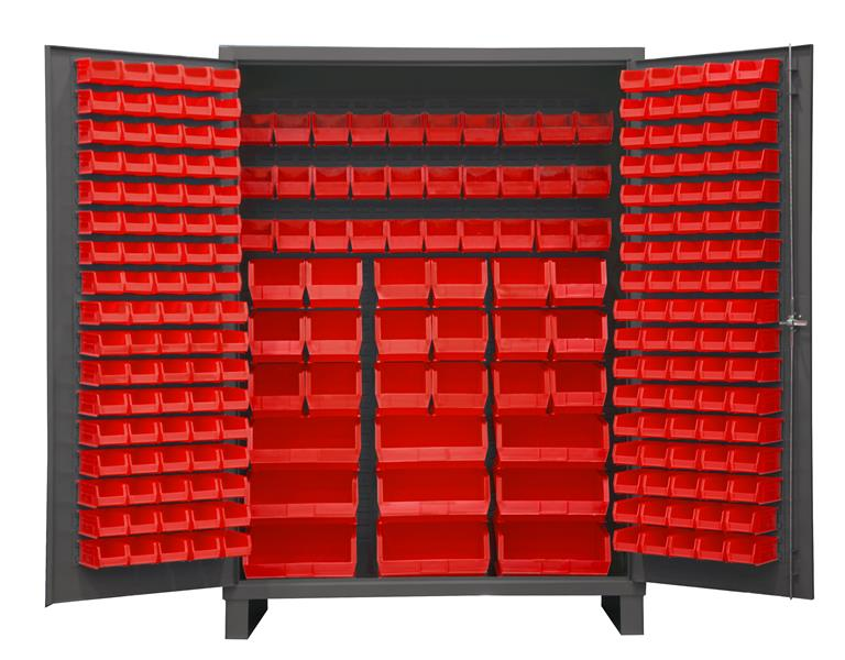 Ventilated Cabinet, 60 in. wide 14 gauge extra heavy duty ventilated cabinet with 227 red hook-on bins. Fully welded louvered panel back reinforces back. Sturdy 3-point steel locking handle with 3/8 in. diameter rods and Provisions F.