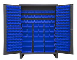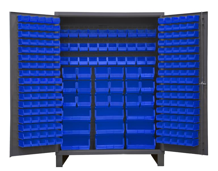 Ventilated Cabinet, 60 in. wide 14 gauge extra heavy duty ventilated cabinet with 227 blue hook-on bins. Fully welded louvered panel back reinforces back. Sturdy 3-point steel locking handle with 3/8 in. diameter rods and Provisions F.