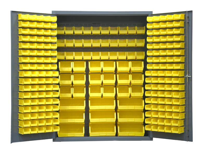 Ventilated Cabinet, 60 in. wide 14 gauge extra heavy duty ventilated cabinet with 227 yellow hook-on bins. Fully welded louvered panel back reinforces back and holds hook-on-bins. Sturdy 3-point steel locking handle with 3/8 in. diameter rods and Provisions F.